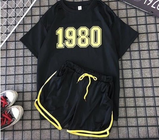 Vintage 1980s Printing Two Piece Tracksuit Set | Korean Short Sleeve Tops and Shorts | Summer Sports Outfit