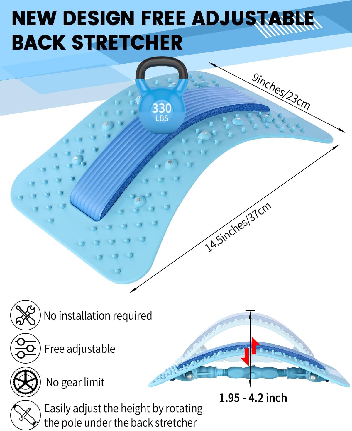 👍Upgraded & Innovative design - This back stretcher increases the contact area and massage contacts of the back, providing the most comfortable way for your back massage/spine decompression. Spine boards are equipped with foam strips to provide cushioning. It has Multi-leve adjustable curve settings that can be easily adjusted to achieve the desired stretching effect.