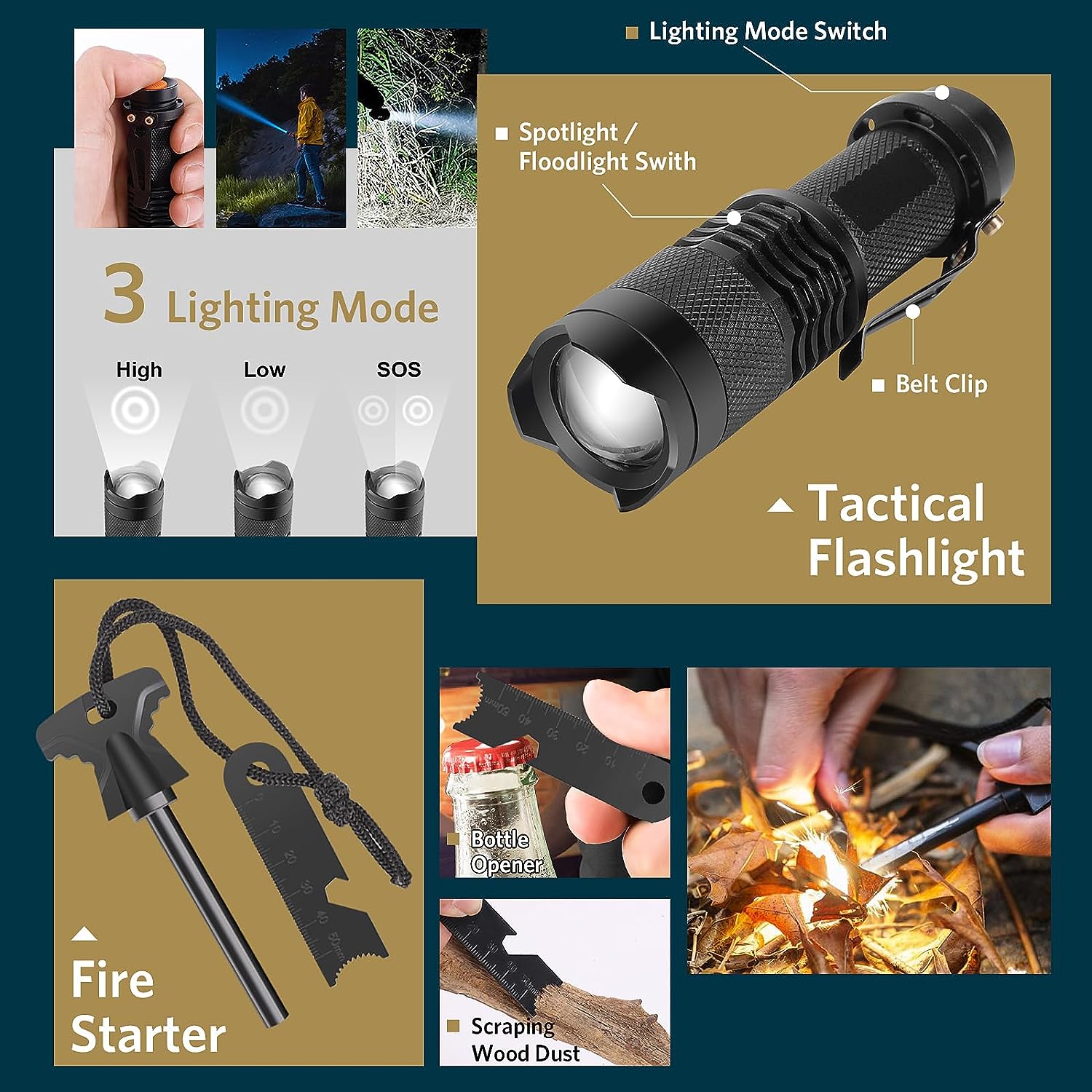【High Quality Survival Kits】This is a high quality survival tool set. The tool box is made of military grade ABS material. And all the survival gears in it are made of high-quality, long lasting materials, providing excellent safety and durability. This survival kit is a perfect and reliable companion to be prepared for any emergencies. It’s an unique and thoughtful gift for dad mum family friends from daughter son.