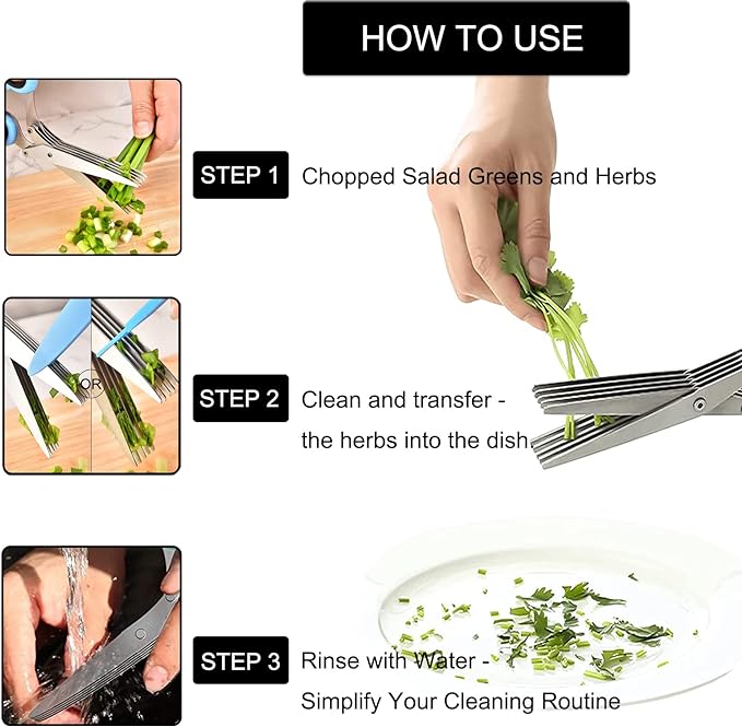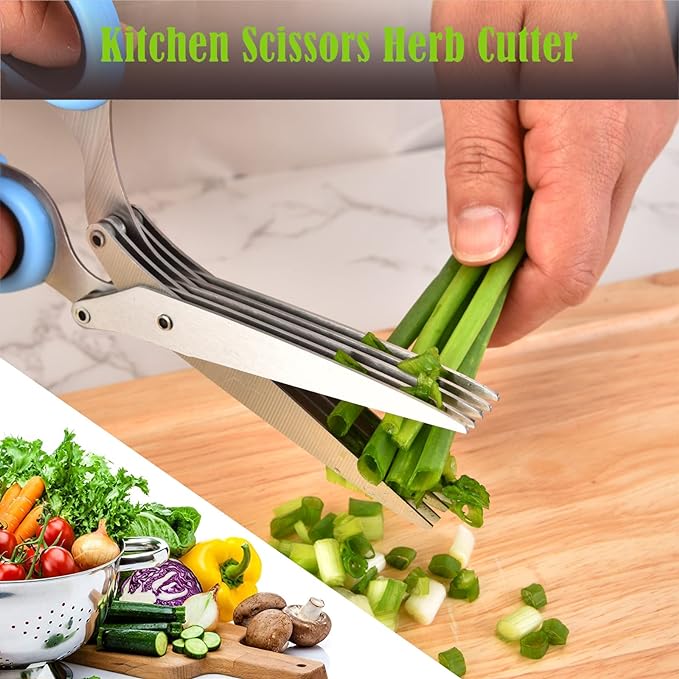 - 【Updated 2023 Herb Scissors with 5 Blades and Cover】Our herb scissors have been updated for 2023 with 5 sharp blades and a cover to protect the blades when not in use. These kitchen shears are perfect for cutting herbs, including cilantro and green onion, as well as for chopping vegetables for salads and other dishes.