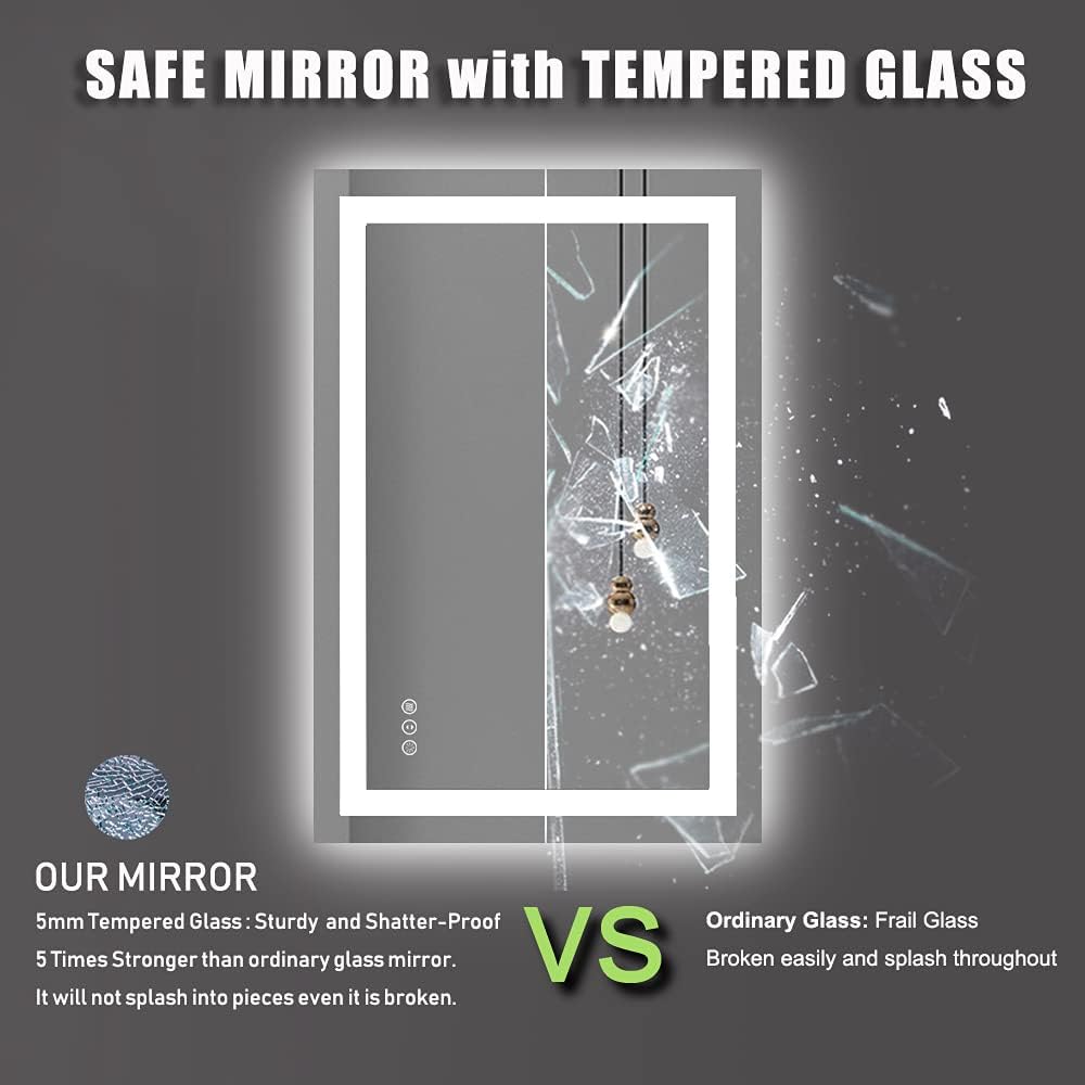 【Colors Changeable & Brightness Dimmable】- This illuminated mirror is multifunctional. You can press the button to change the color temperatures: Warm(3000K), natural (4000K) and white(6000K). You can also dim the brightness to your comfortable level. All these will be easily controlled by the touch button. The smart memory function will record the lighting setting and keep the previous lighting status after turning off and on.