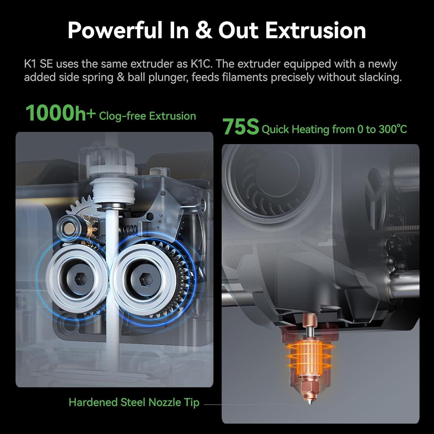 The integrated steel-tipped copper nozzle and titanium alloy heatbreak offer long-lasting durability and resist heat creep. Combined with a powerful ceramic heater, the K1 SE heats from 0 to 300℃ in just 75 seconds, perfect for fast, high-quality prints using materials like ABS and more.