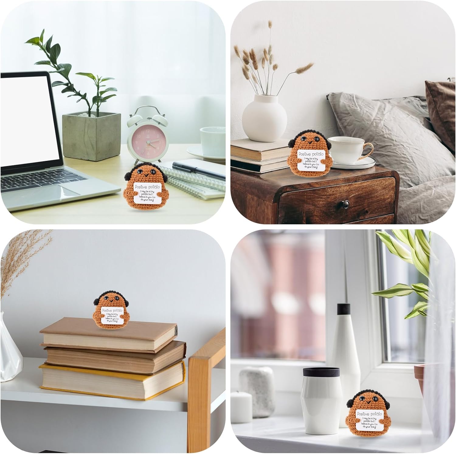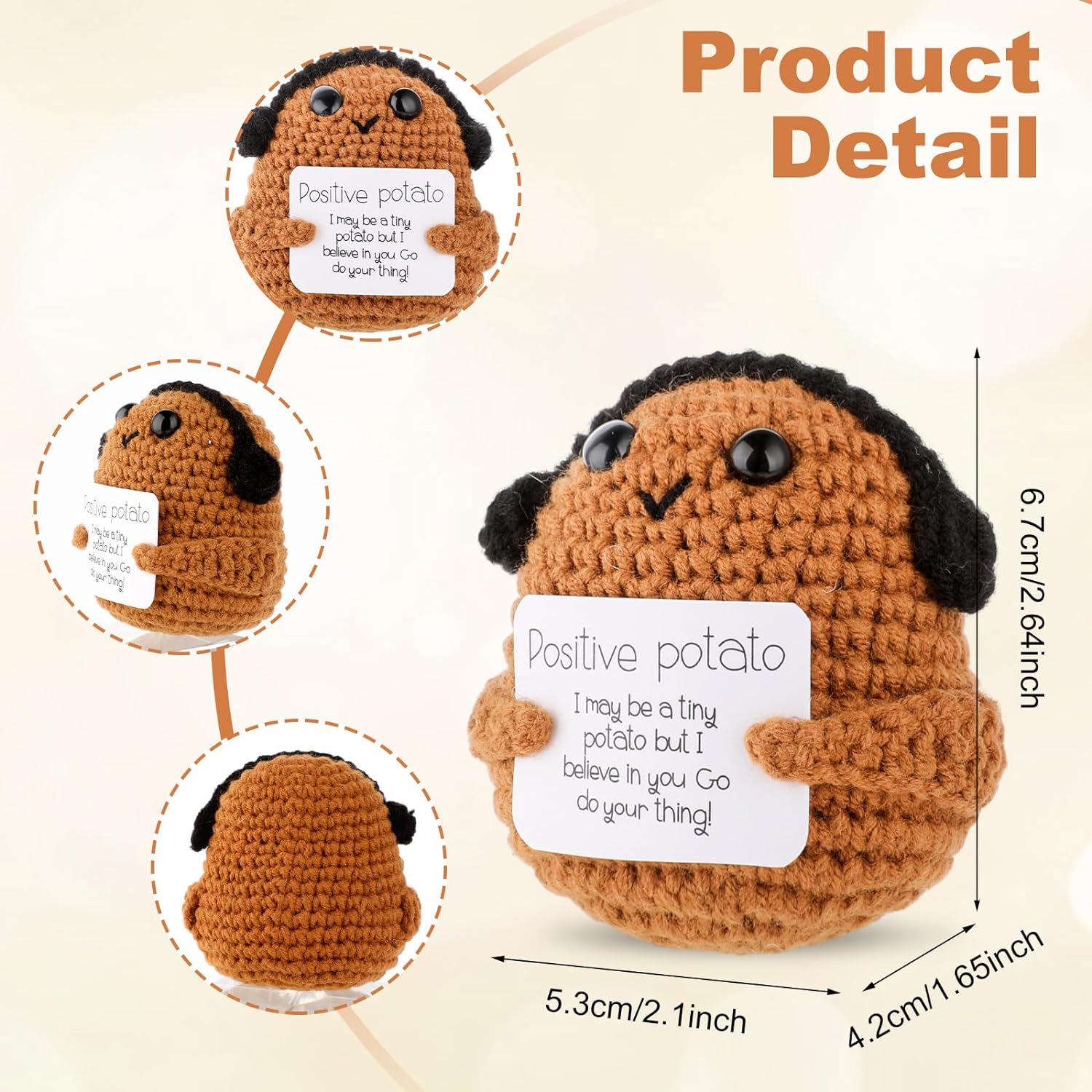 - Happy Everyday: Our funny positive potato knitted doll is very cute, and the words in the card are inspirational. You will happier if you see the doll when you are happy, while it will make you happy when you're upset. The positive potato doll will accompany forever.