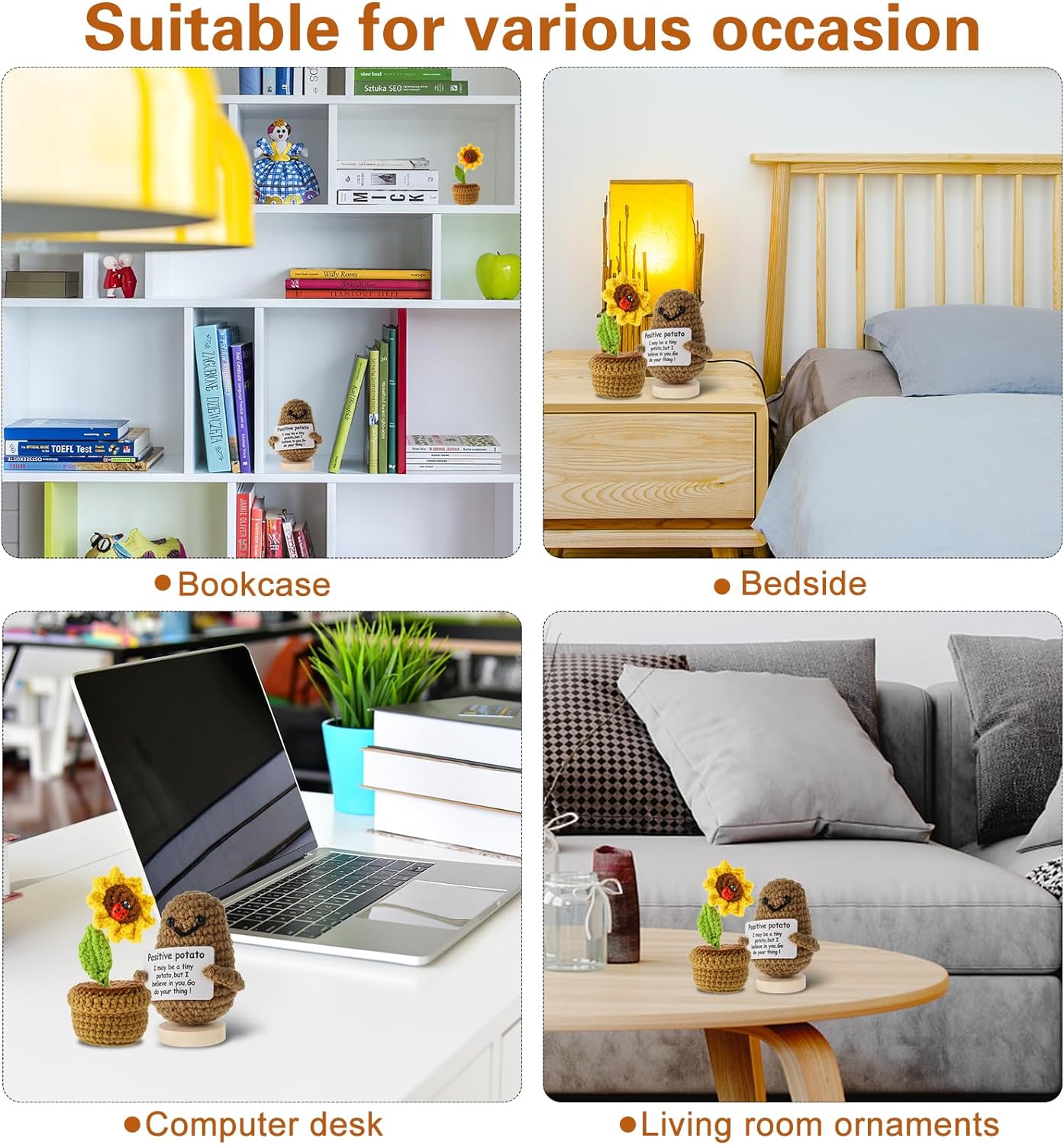 - Emotional Support Potatoes: Our crochet positive potato dolls and sunflowers pots, are not just cute; they are the perfect desk decoration. Their charming expressions and the inspiring messages on the cards will lift your spirits, making them a delightful addition to your workspace or living area.