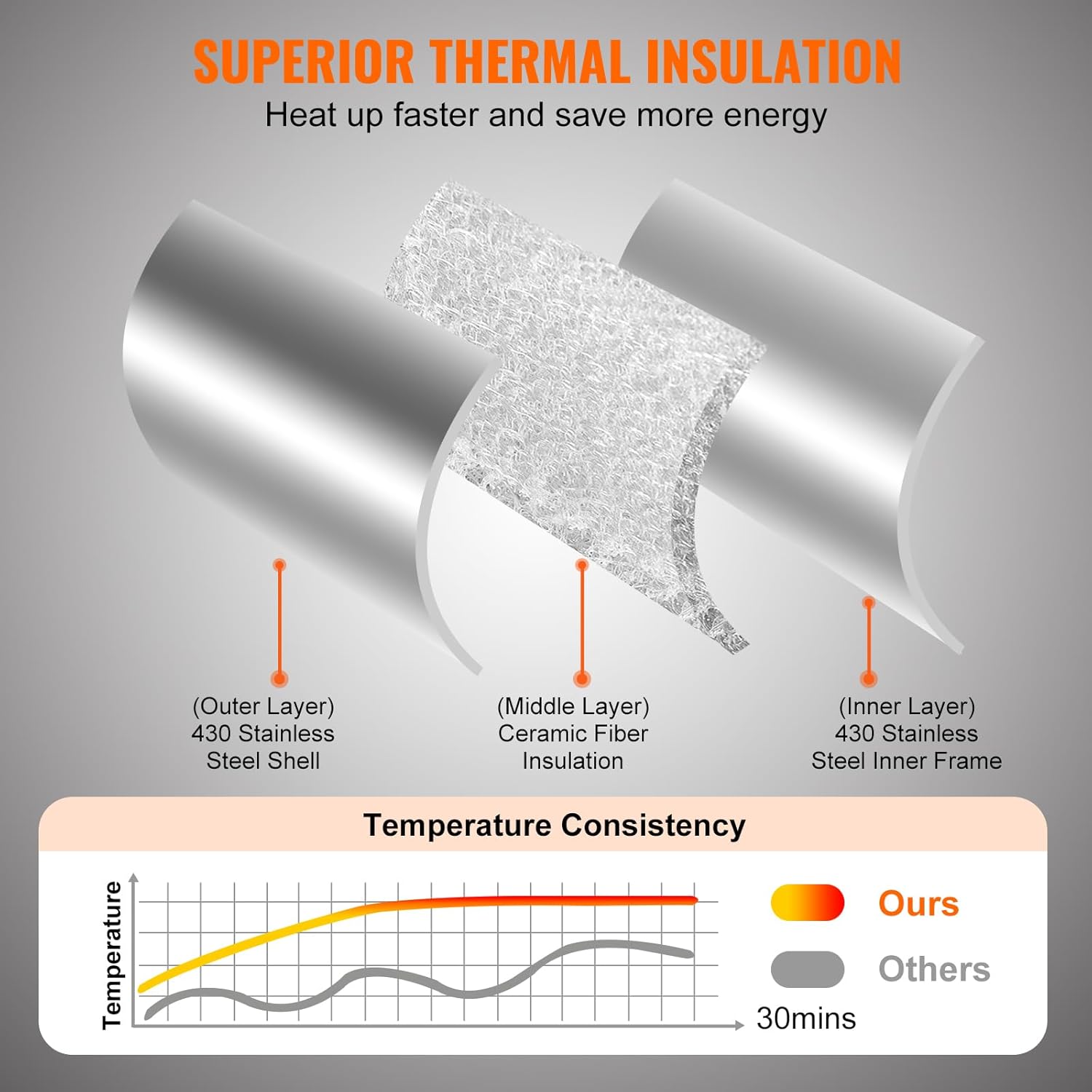 Crafted with a durable 430 stainless steel inner frame, ceramic fiber insulation, and a cold-rolled steel shell, this oven boasts a 3-layer thermal insulation system that locks in heat and flavor. It’s CSA certified, so you can cook confidently and safely every time.