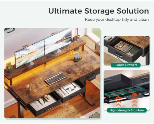 ProLift Electric Standing Desk with Storage – 55 inch” High-End Sit-Stand Desk with Power Outlets & LED Light Strips 🌈⚡