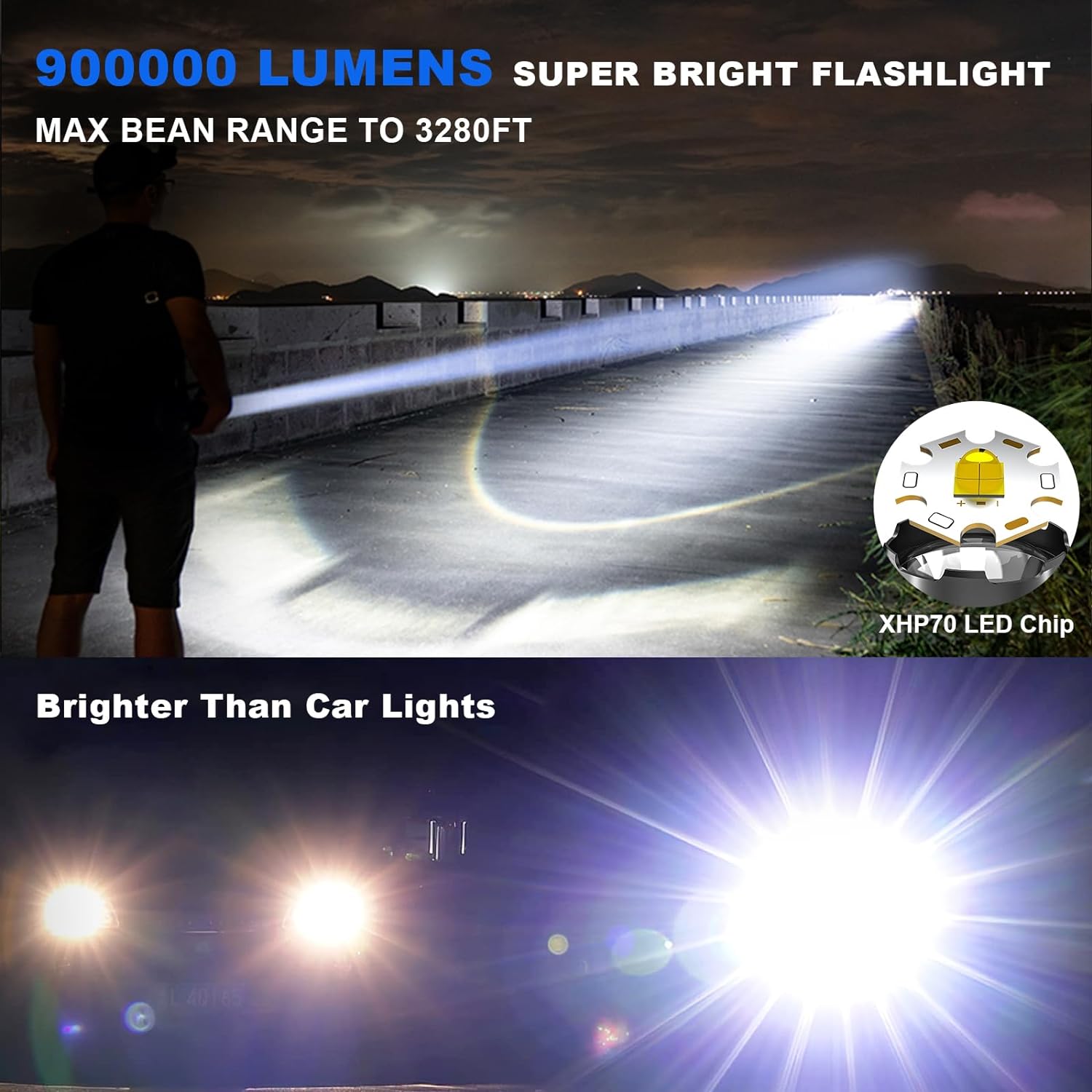 🔦【Super Bright Flashlight】Cinlinso high lumens flashlight equipped with an upgraded XHP70 LED wick, which max output up to 900000 lumens. Projects a wide beam of light that clearly illuminates things within 3280 feet, easily lighting up an entire room or backyard. This brightest flashlight can be easily used in various situations such as camping, hu∩ting or emergencies.
