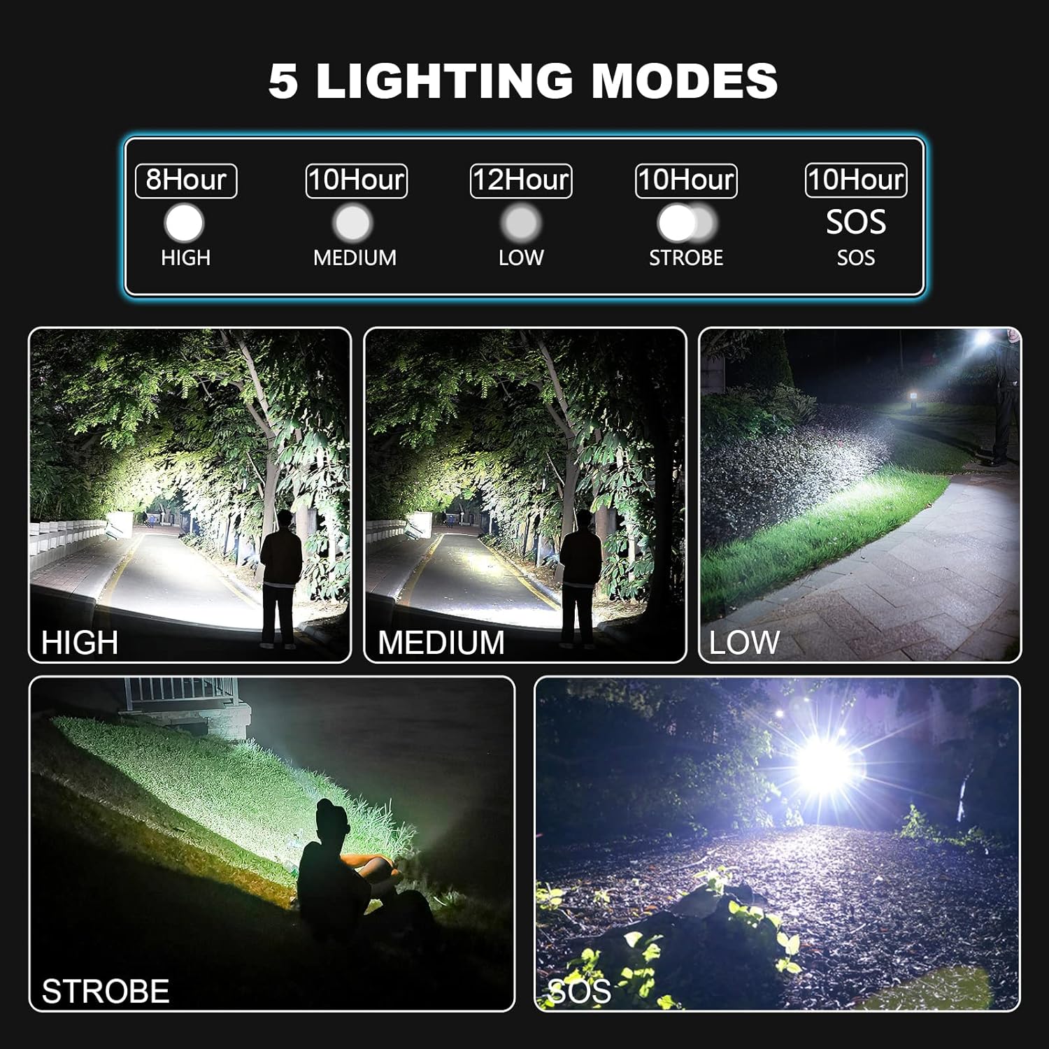 🔦【5 Lighting Modes】The flashlight has 5 lighting modes. Single-click the switch button, works in normal lighting mode: High/Medium/Low/Strobe/SOS, suitable for emergencies, camping, hu∩ting, etc. It is worth noting that long press for 2-3 seconds to close, without the need for loop mode to close.