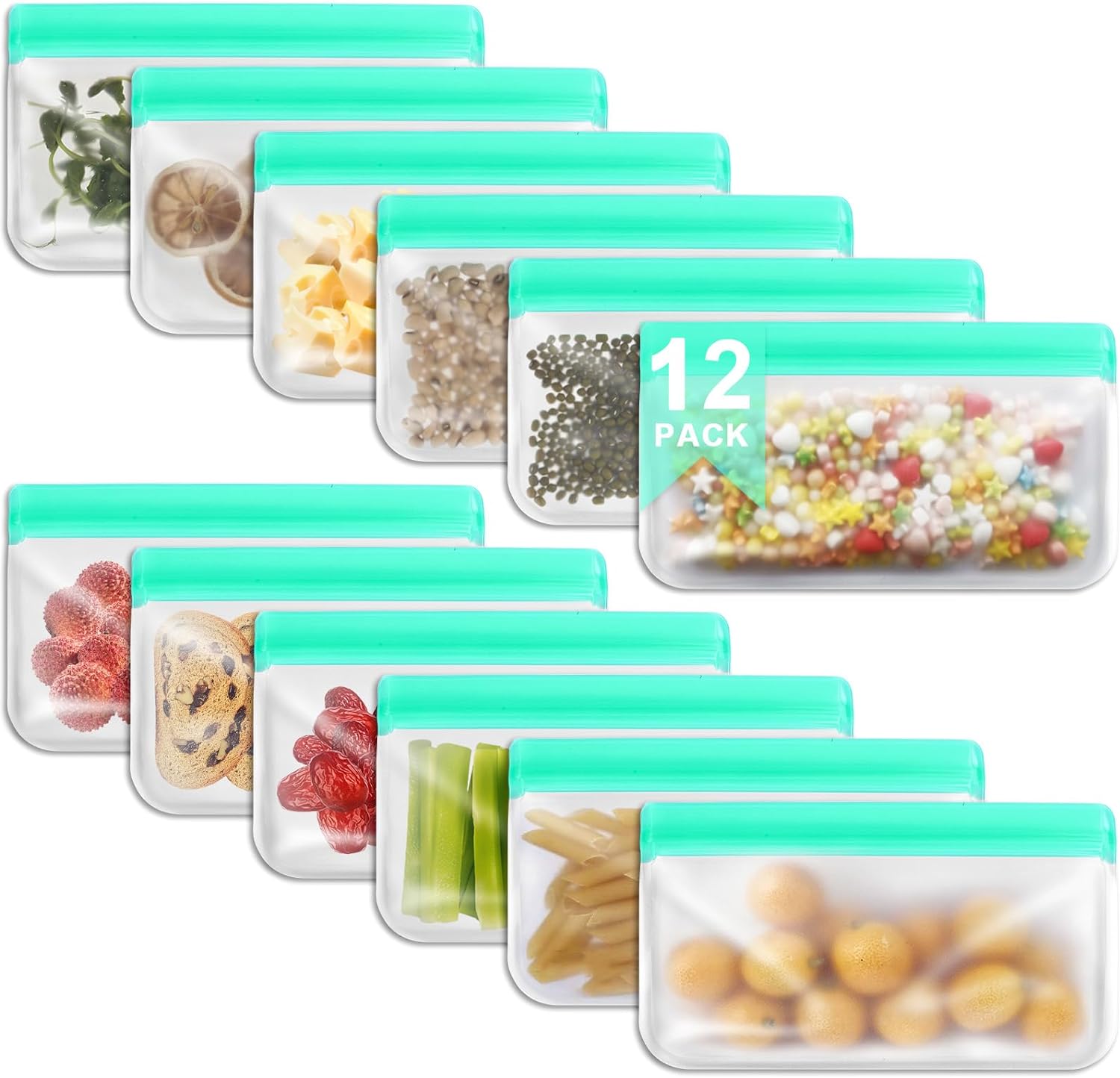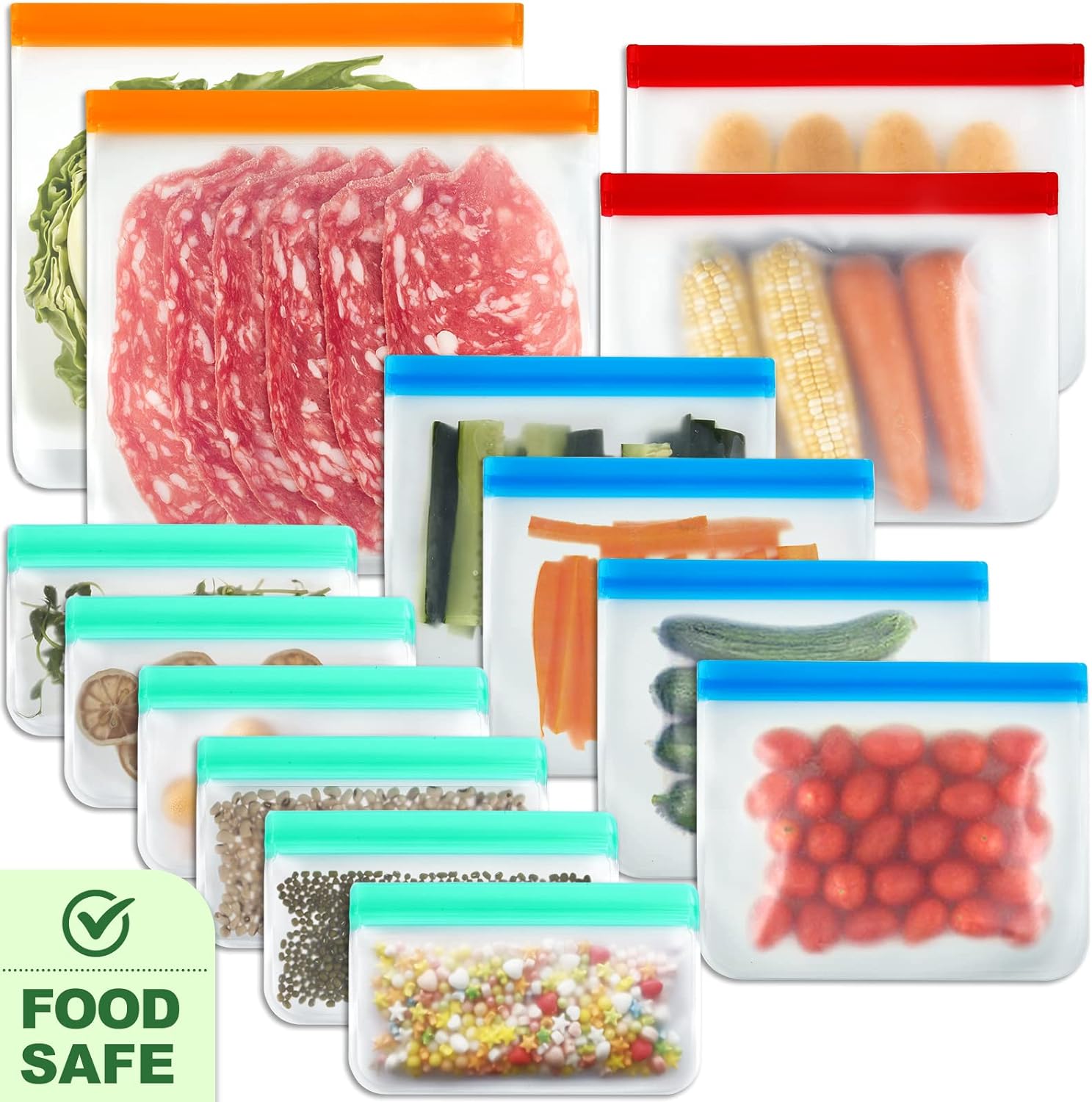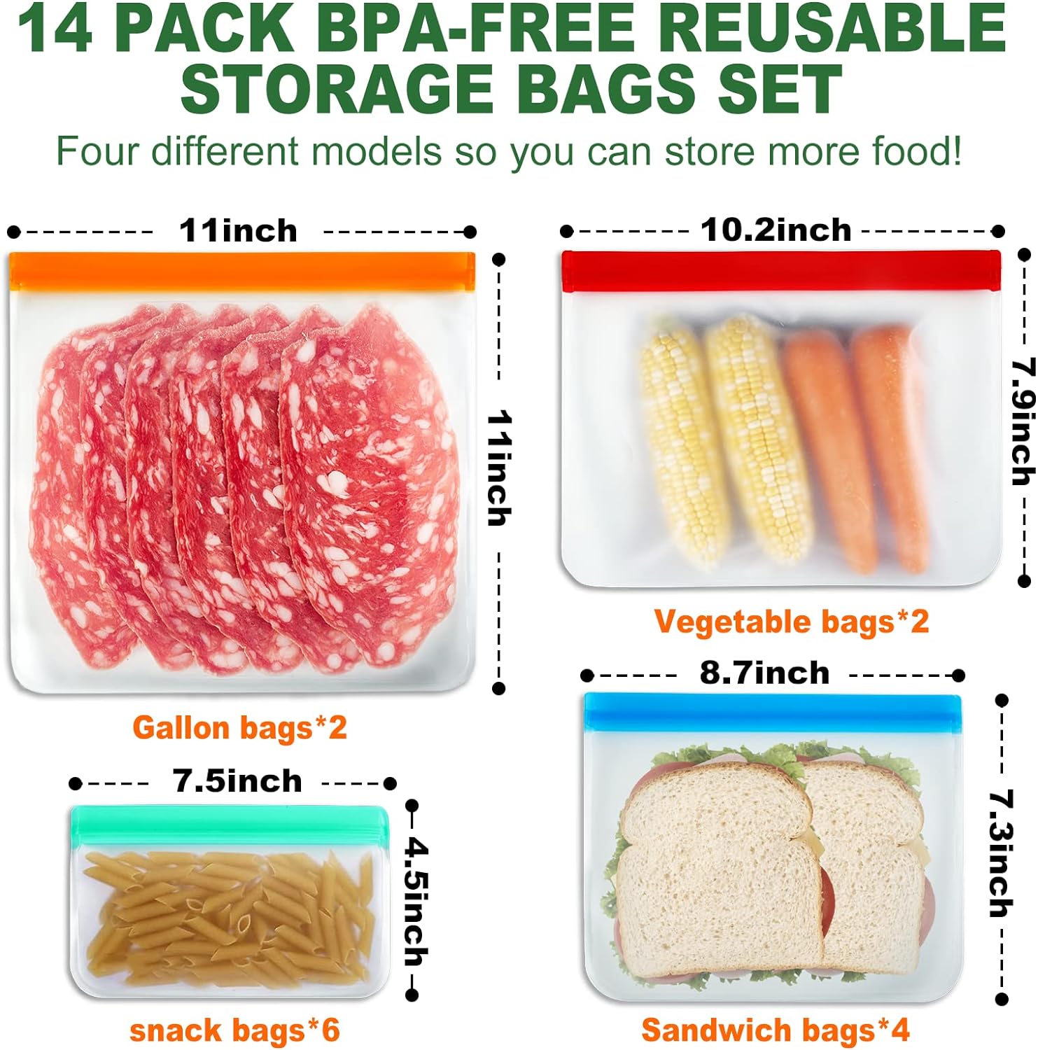 ♻【NEW HOME ESSENTIALS MUST HAVES】 14 pack reusable bags various sizes set, contains 2 extra large reusable gallon freezer bags (11 x 11 inches) are great for marinating meats, frozen foods, cereal, cookies, office supplies; 2 food storage bags is 10.2 x 7.9 inch, 4 sandwich bags containers is 8.7 x 7.3 in and 6 snack bags is 7.5 x 4.5 in, are perfect container for sandwiches, snacks, lunch, vegetables, fruit, babies food, cosmetics, jewelry make-up, stationery, travel and more.