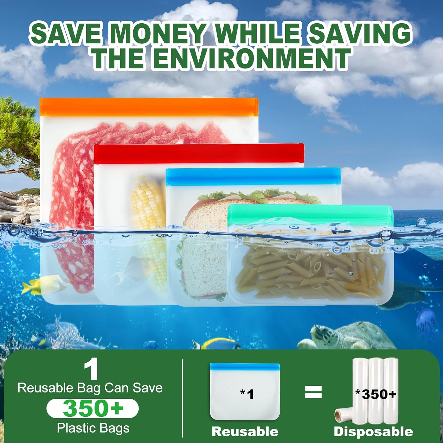 ♻【FOOD GRADE MATERIAL & REUSABLE】Made of food-grade PEVA material, reusable storage bags are PVC-free, lead-free, chloride-free and BPA FREE, an eco-friendly and recyclable material. You don’t need worry about your heath with these food bags and they are not harmful to the environment. One reusable silicone bags can save up to 350+ disposable plastic bags, save our planet and save your money.