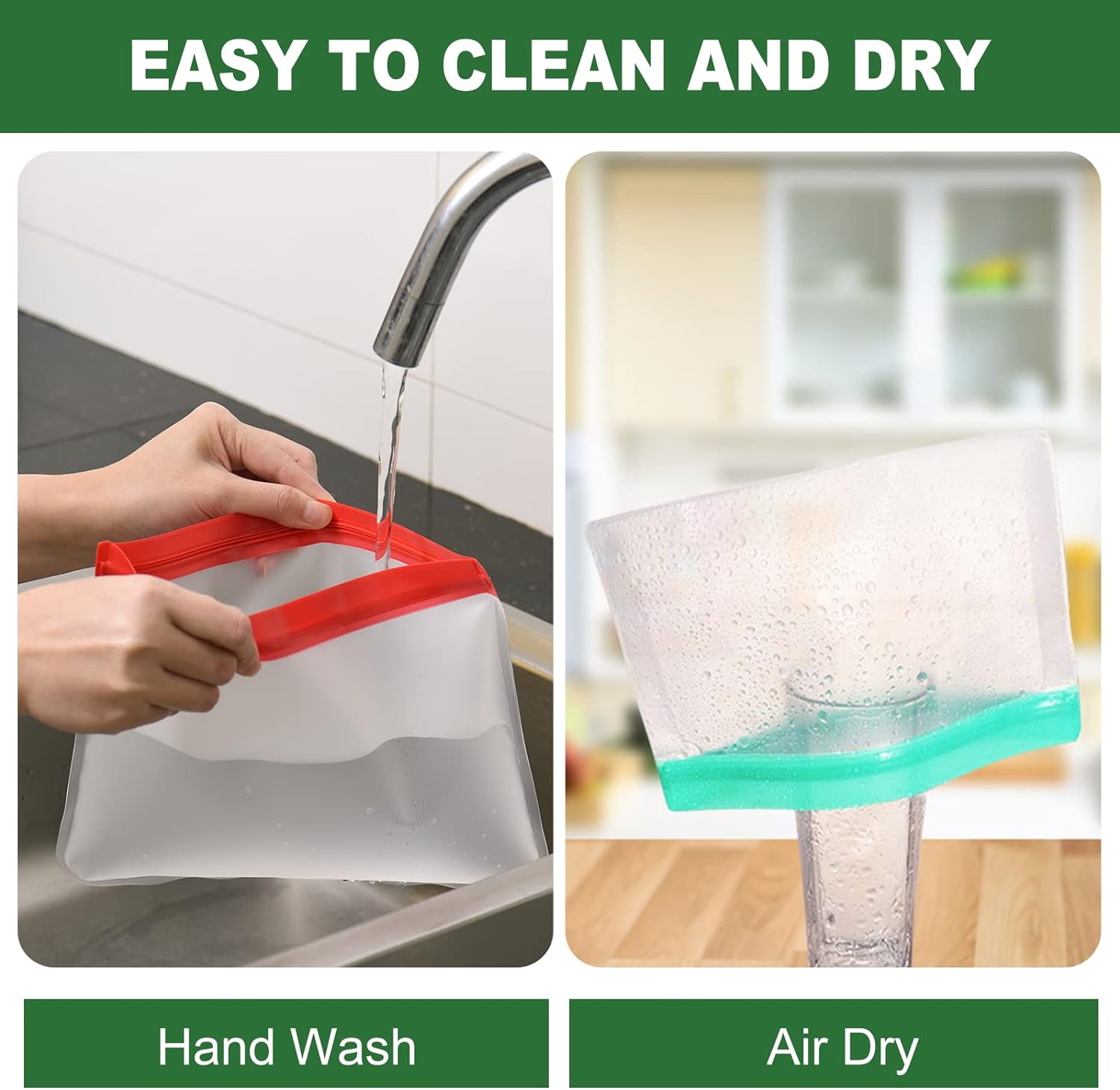 ♻【FREEZER ORGANIZATION & EASY TO CLEAN】The reusable freezer bags meal prep container can lock out freezer burn while keeping food fresh and full of taste, perfect for freezing meat, chicken, fish, fruits, and vegetables. Please do not use in the dishwasher. We recommend HAND WASH, for the dishwasher will damage the zipper of the food storage bags. Clean with the bottle brush and put the bags on the top of a mug or cup to air dry.